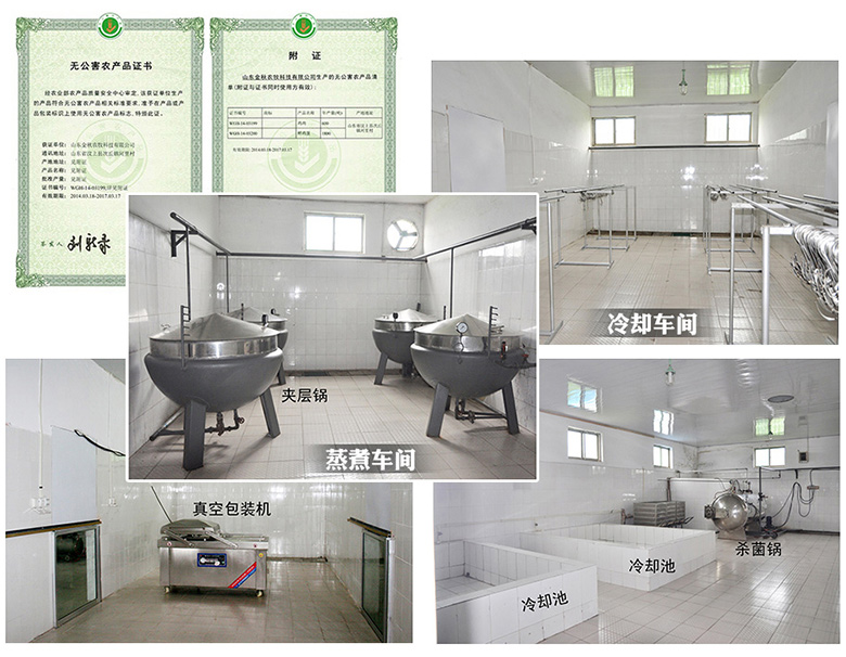 山東金秋農牧科技股份有限公司建于2010年,專門對汶上蘆花雞精深加工,先后研發出蘆花燒雞、蘆花三寶、腌雞蛋等十幾個產品。公司遠離城市污染,保證了產品的安全、綠色,現代化的禽類屠宰和熟食加工生產流水線完全滿足了“QS”生產的要求,完全符合出口食品加工(HACCP)標準,2010年5月牽頭起草了《汶上縣蘆花雞標準》,并在省質量技術監督局備案。2014年被評為“無公害農產品”和“山東老字號”稱號,并通過了食品安全管理體系22000認證。2015年被評為“食安山東”全省性畜牧示范品牌帶領企業。
